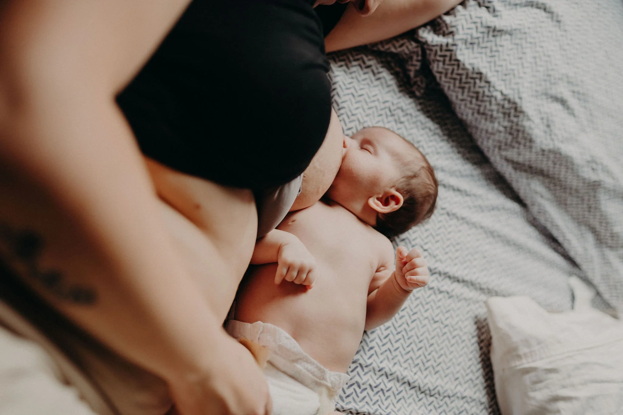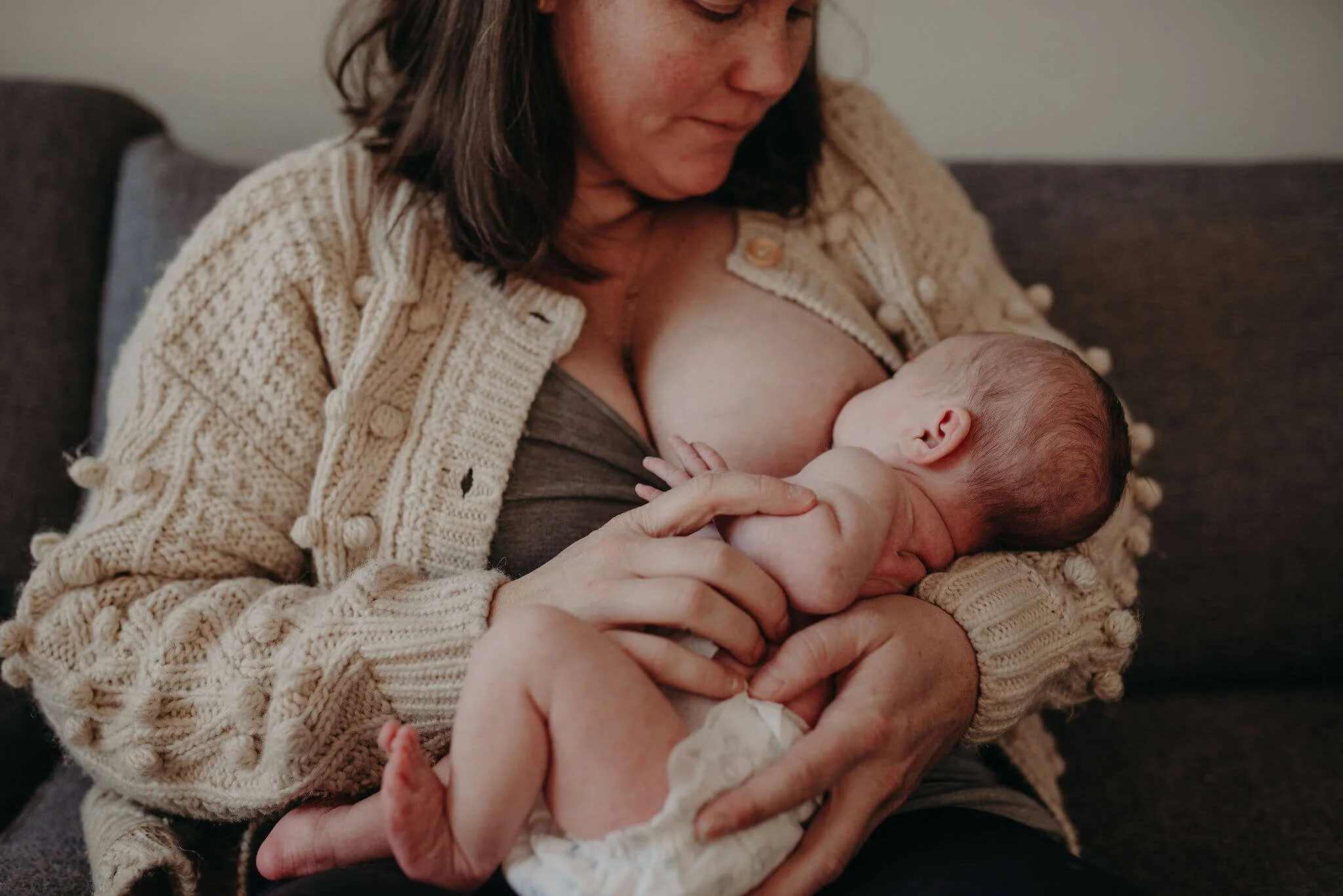 A baby breastfeeds from their mother, who is receiving lactation support during her consultation with Piena Lactation and Wellness in Los Angeles.