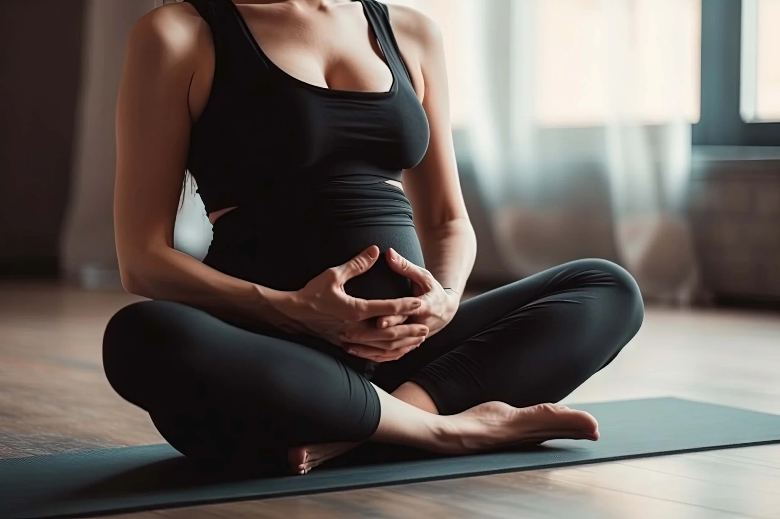 A pregnant mother breathes deeply during her perinatal mental health coaching session with Piena Lactation and Wellness in Los Angeles.